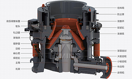 HPT系列多缸液压圆锥破碎机工作时,电机通过皮带轮和三角带带动设备传动轴转动,传动轴通过大小锥齿轮带动偏心套绕主轴转动,偏心套带动动锥做旋摆运动,使动锥和定锥时而靠近、时而远离轧臼壁,物料在轧臼壁和破碎壁形成的破碎腔内不断受到挤压、冲击而破碎,破碎的物料从下部排出。