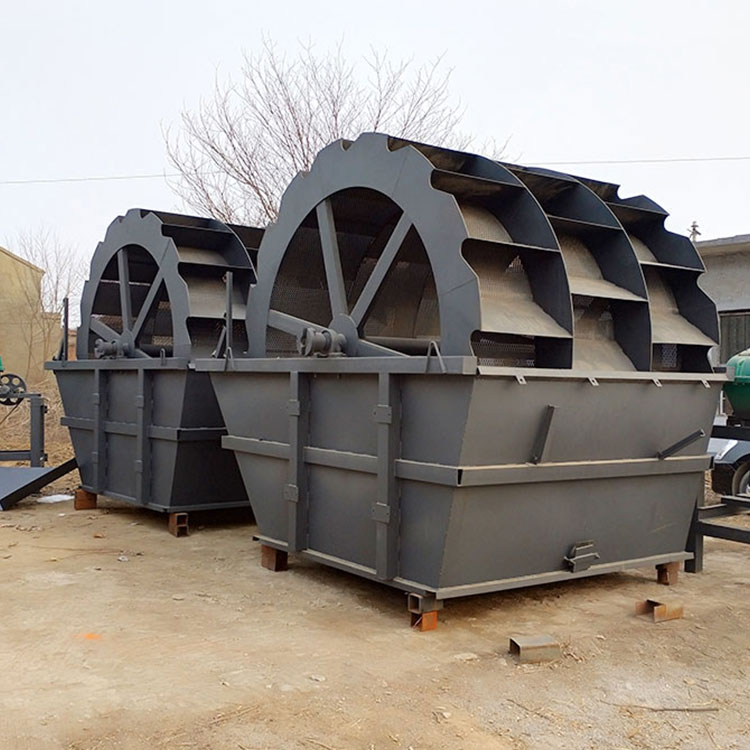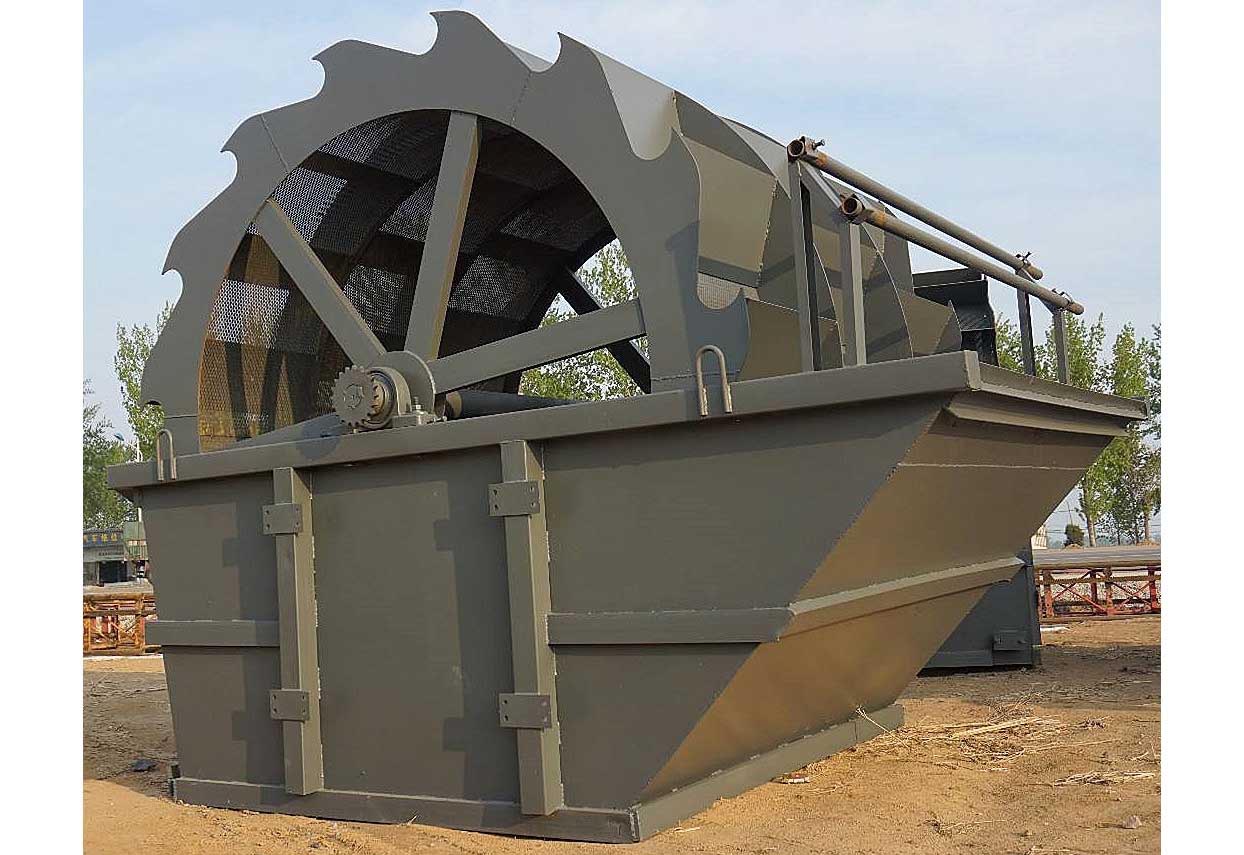 工作时,电机通过三角带、减速机、齿轮减速后带动叶轮缓慢转动,砂石有给料槽进入洗槽中,在叶轮的带动下翻滚,并互相研磨,除去覆盖砂石表面的杂质,同时破坏包覆砂粒的水汽层,以利于脱水;同时加水,形成强大水流,及时将杂质及比重小的异物带走,并从溢出口洗槽排出,完成清洗作用。干净的砂石由叶片带走,砂石从旋转的叶轮倒入出料槽,完成砂石的清洗作用。