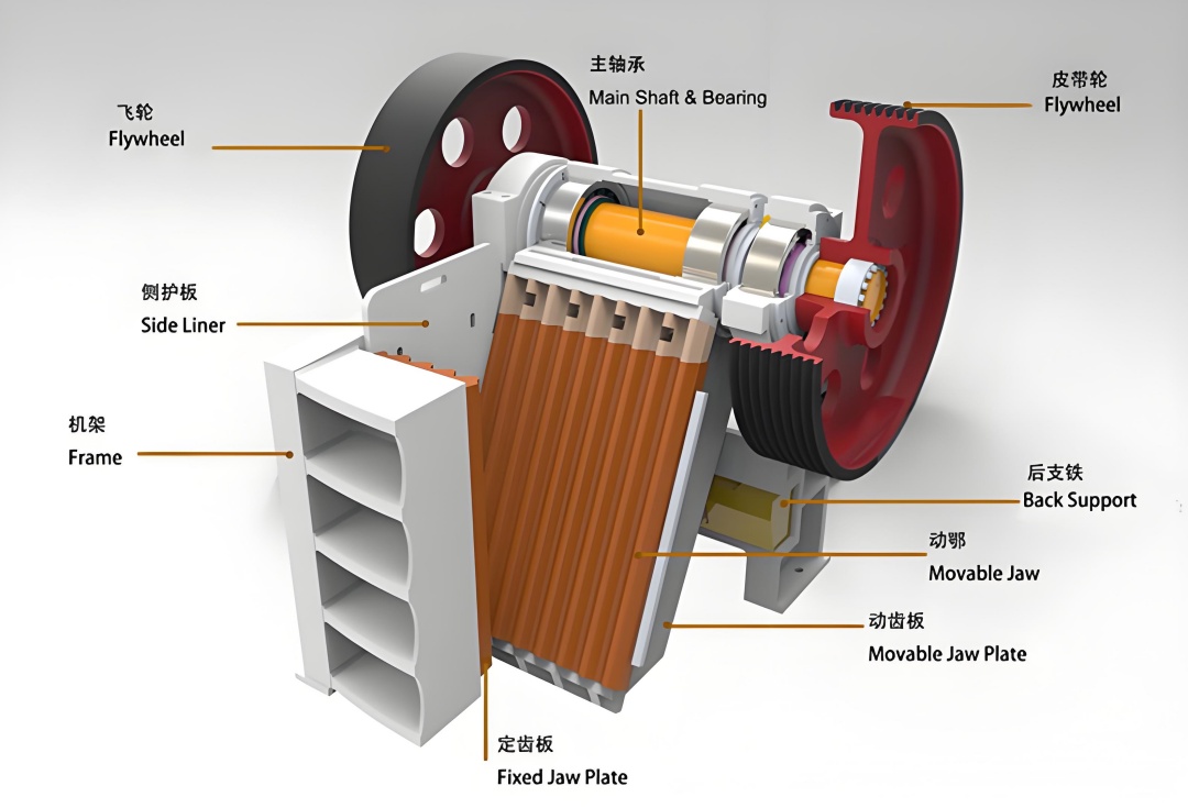 PEV系列颚式破碎机:采用独特的V型腔体设计;前后分档分别单独铸造与侧板、整体式轴承座,销栓连接,使得破碎机的运输更加方便;电机架与破碎机为一体式,减小了破碎机的安装空间和V带长度,电机和破碎机同步运动,增加了V带寿命;破碎腔型优化,各类矿石破碎都有与之相配的齿板,比传统的颚破产量更高。
